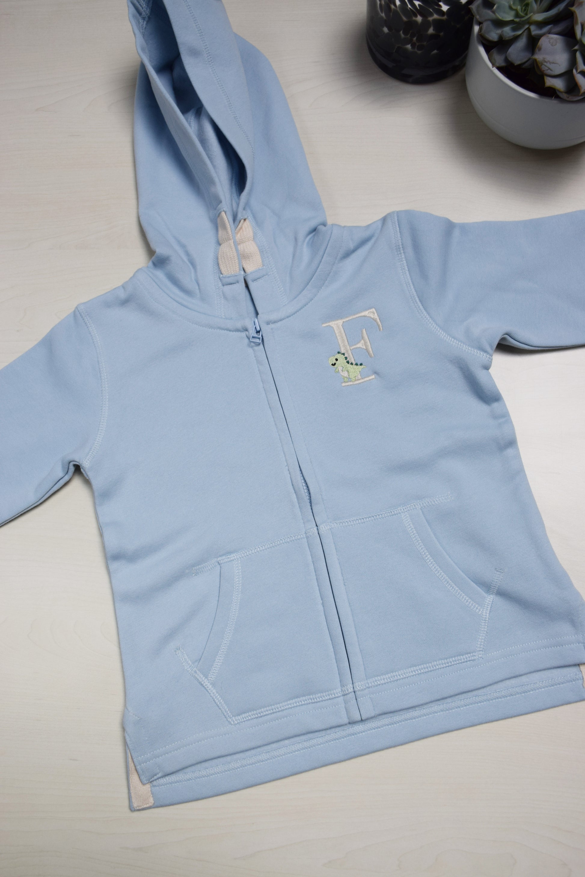 Wat deze hoodie echt bijzonder maakt, is de mogelijkheid tot personalisatie. We borduren een initiaal en een schattig figuurtje van jouw keuze op de borst. Zo creëer je een uniek kledingstuk dat volledig past bij de persoonlijkheid van je kleintje.